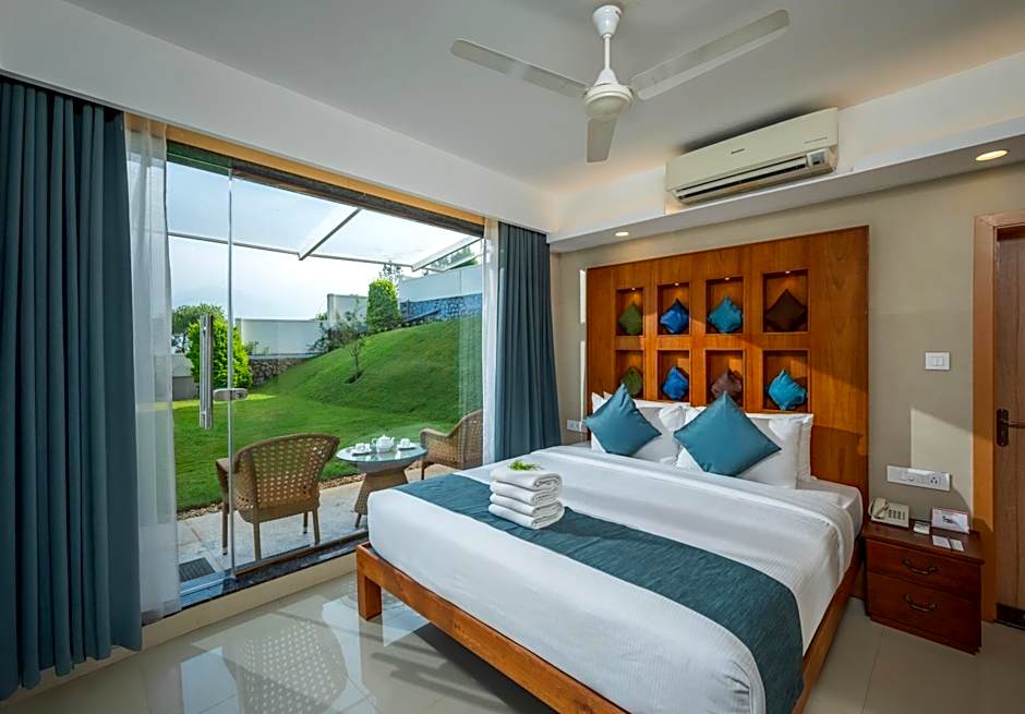 This villa features a balcony, stovetop and seating area.